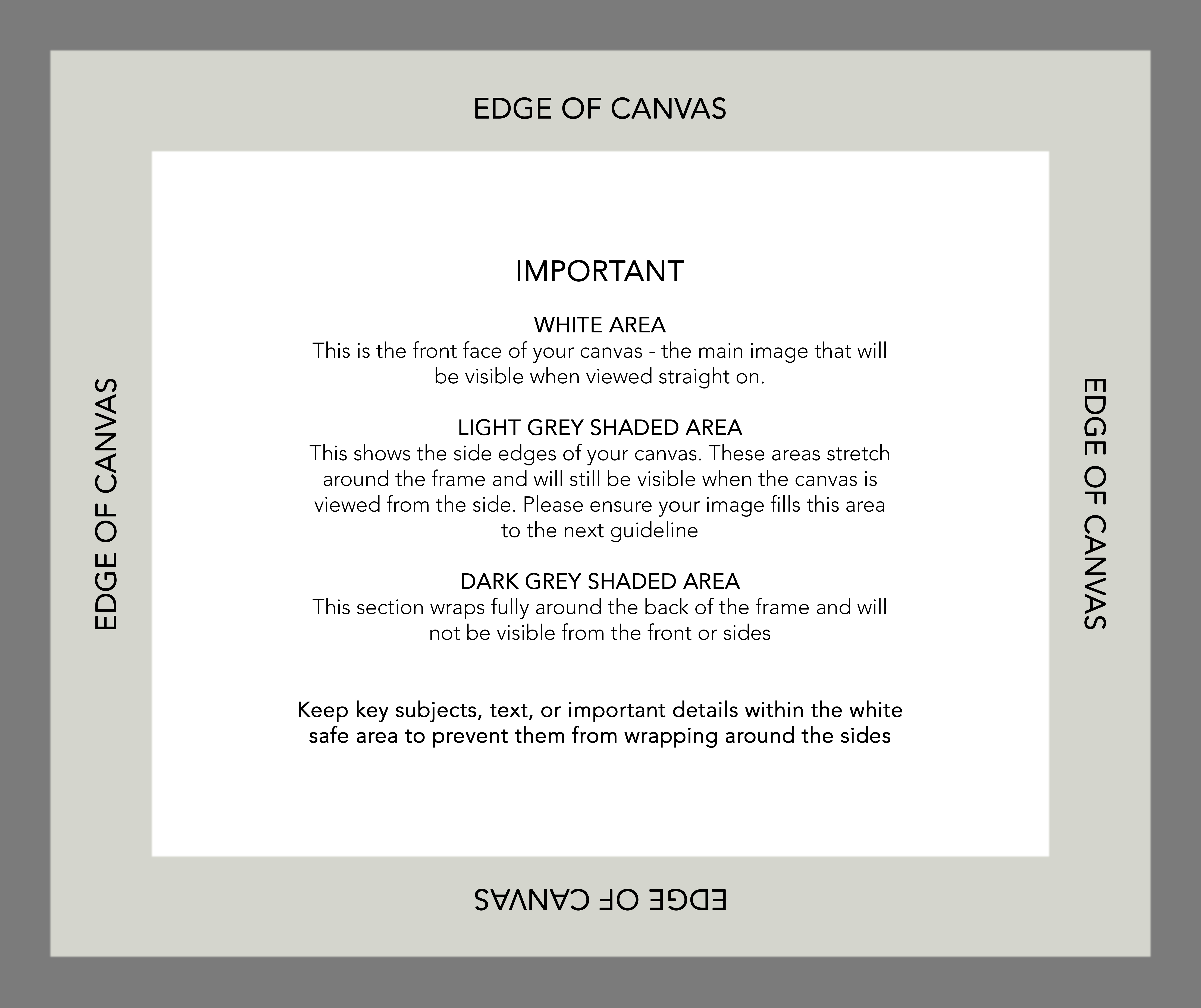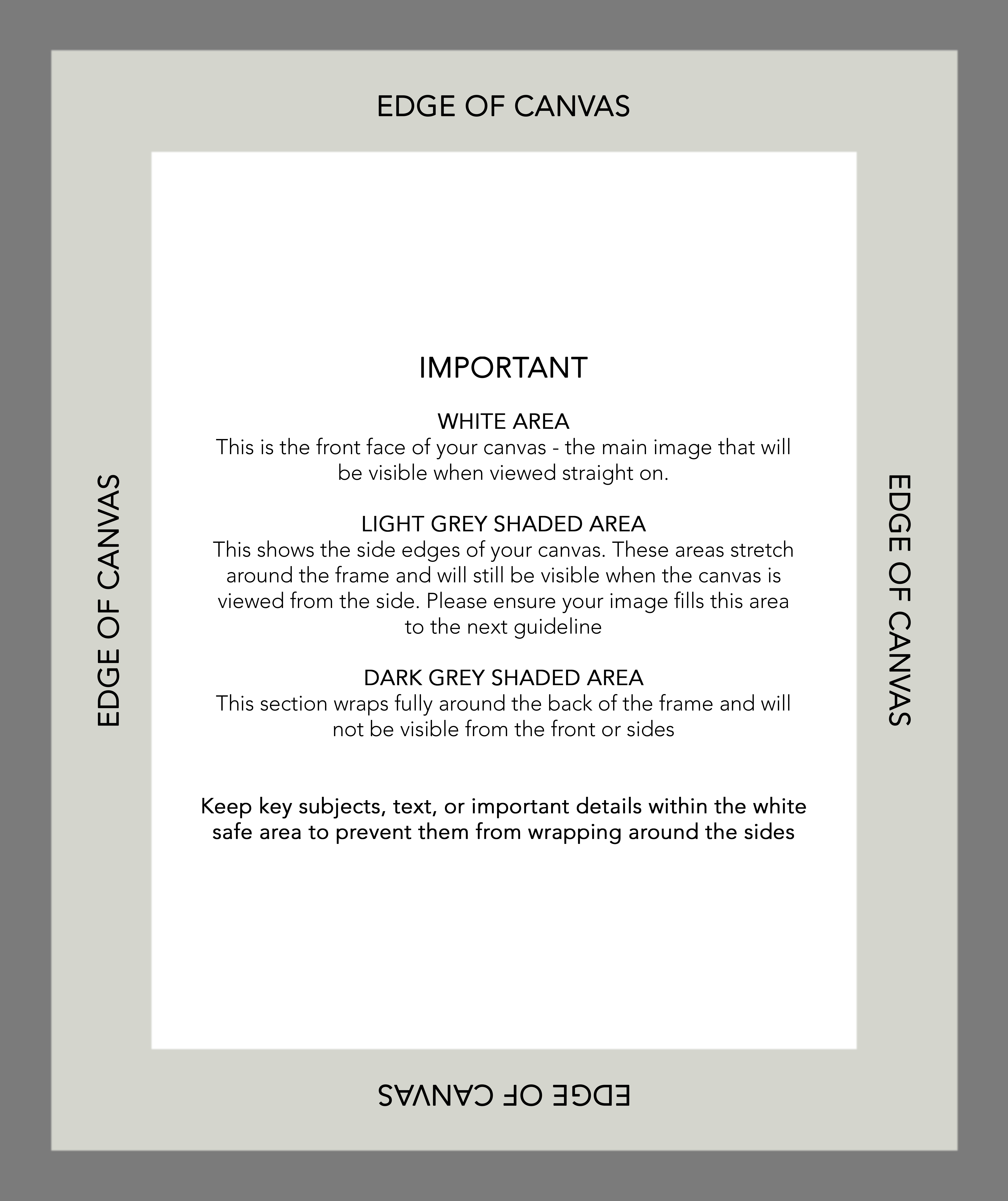 To create your canvas, you’ll need to use our free Photoshop or Canva templates. Each template clearly shows the viewing area, as well as the side and back wrap, ensuring your design is set up correctly for production.
