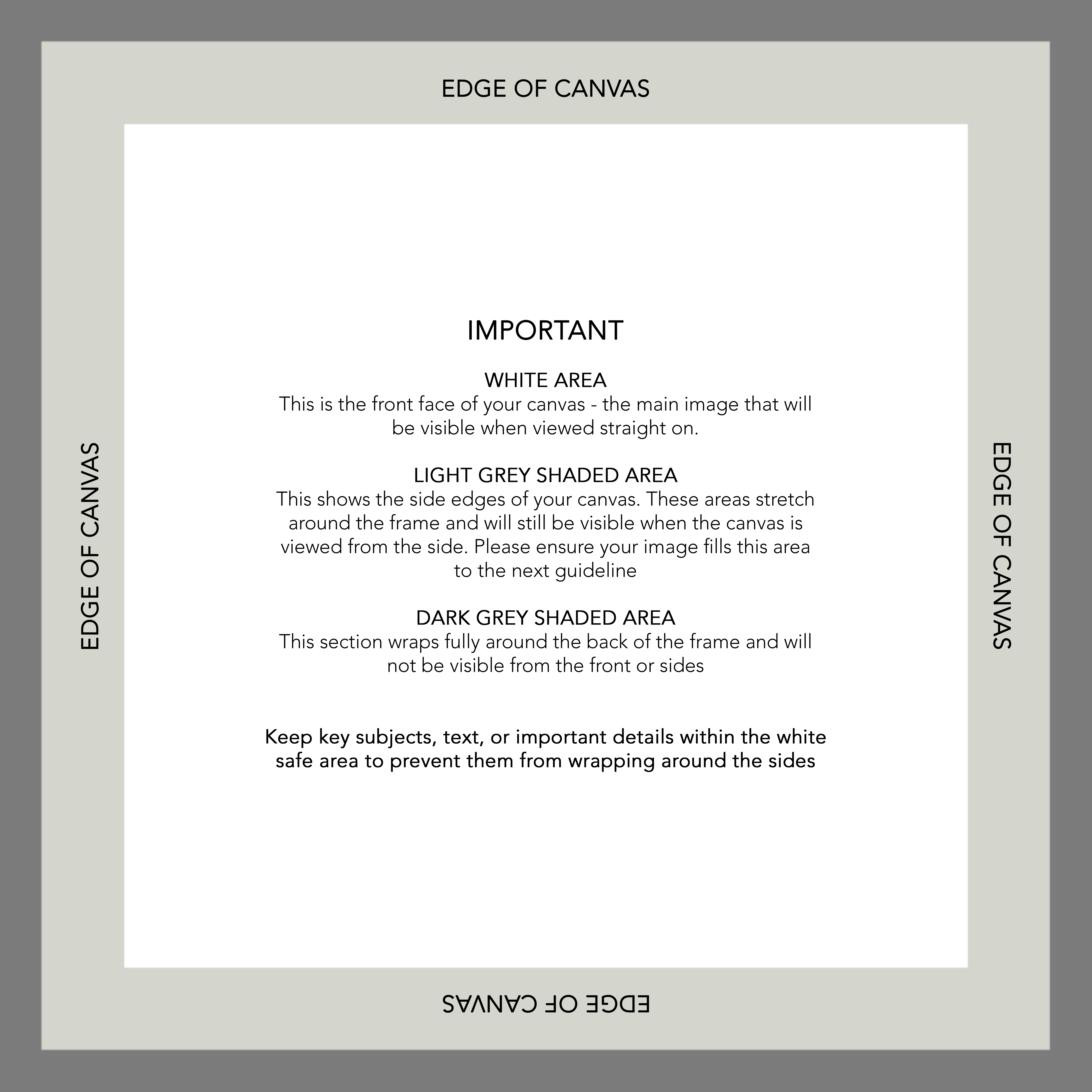 To create your canvas, you’ll need to use our free Photoshop or Canva templates. Each template clearly shows the viewing area, as well as the side and back wrap, ensuring your design is set up correctly for production.