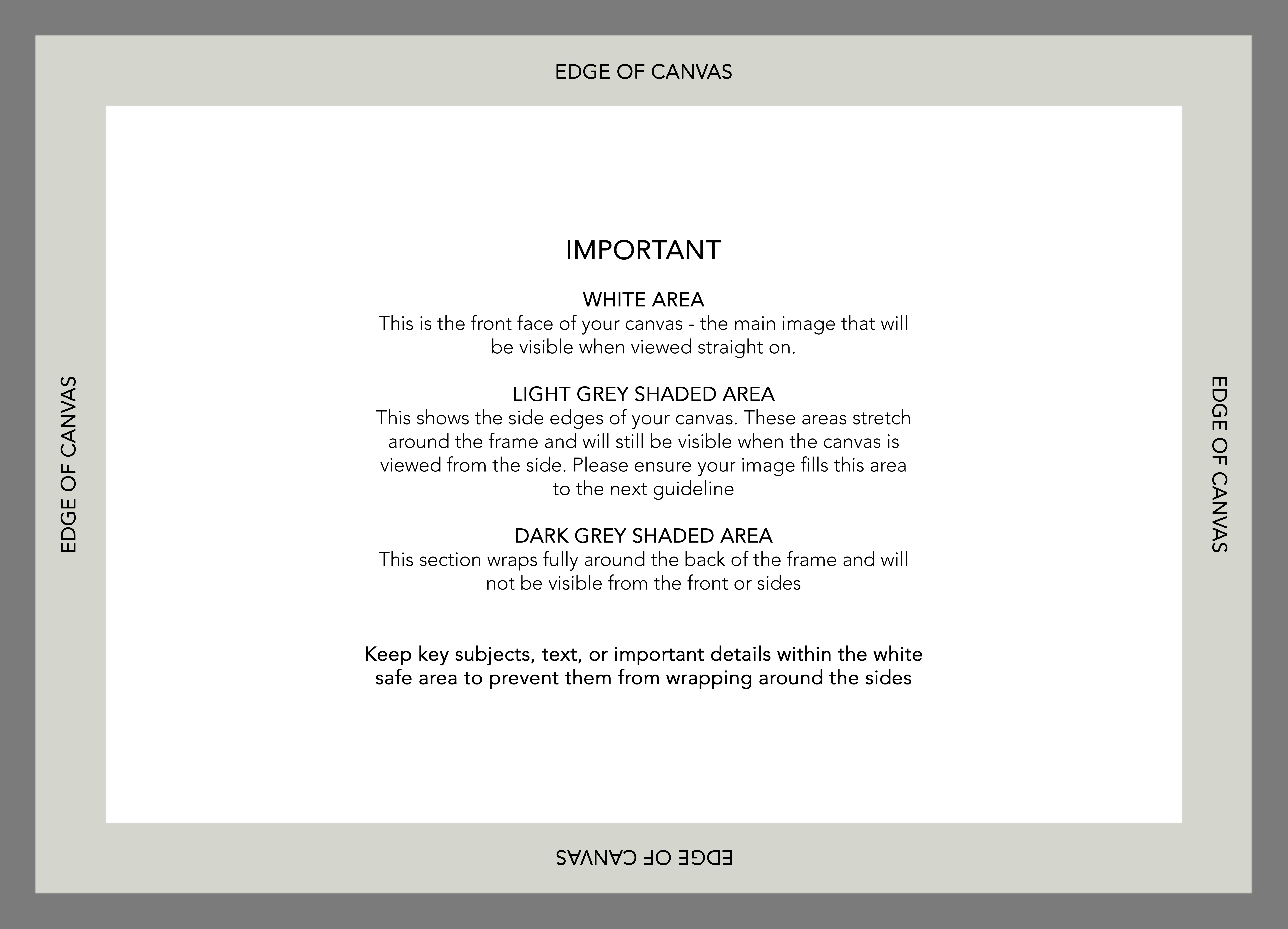 To create your canvas, you’ll need to use our free Photoshop or Canva templates. Each template clearly shows the viewing area, as well as the side and back wrap, ensuring your design is set up correctly for production.